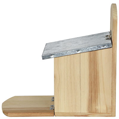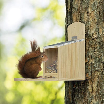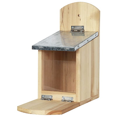 Nøddeautomat til egern. Måler 11 x 26 x 24,5 cm. Træ med zinktag. Med plast vindue, så egernet kan se maden. Egern er den kloge gnaver. Den lærer hurtigt at løfte låget og spise løs af indholdet. Et egern spiser enten direkte fra brættet, eller gemmer maden et andet sted til forråd. Med 2-3 nøddeautomater i haven, har du gode muligheder for at observere de elegante akrobater.